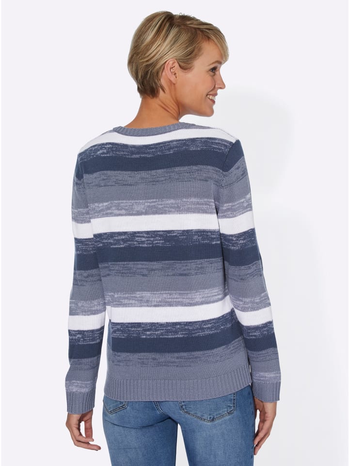 Поддайтесь очарованию этого свитера свежих цветов и стильного полосатого узора. Круглый вырез горловины с небольшим V-образным вырезом и резинкой на длинных рукавах и подоле. Связан трикотажем стандартной посадки.