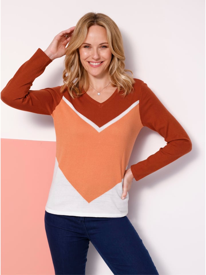 Этот свитер с длинными рукавами выполнен в новом стиле с полосатым узором. Он имеет V-образный вырез и прямой подол.