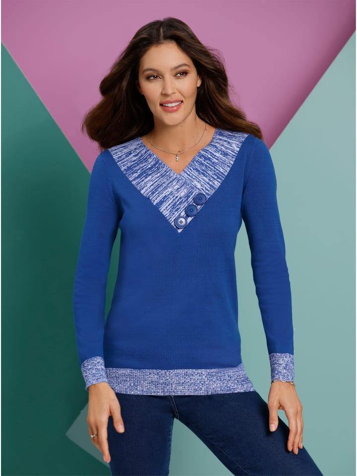 В этом свитере с длинными рукавами привлекает внимание визуально удлиняющий V-образный вырез в меланжевой гамме с декоративными пуговицами. Ребристые манжеты и подол также украшены модным пестрым узором. Изысканная вязка, придающая форму.