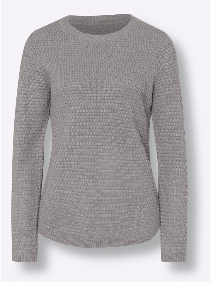 Короче говоря: настоящий фаворит! Этот свитер с длинными рукавами отличается красивым узором вязки по всей поверхности и модным закругленным подолом с декоративными пуговицами.