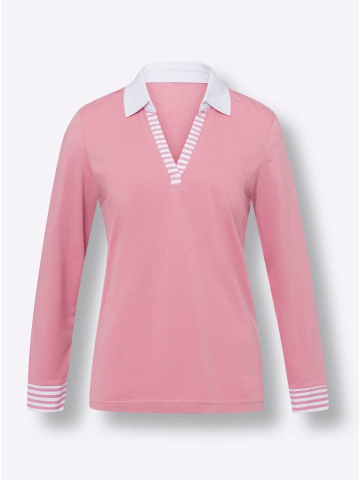 Сочетание однотонных и полосатых цветов делает эту удобную рубашку с длинными рукавами такой привлекательной. Она дополнена контрастным воротником. V-образный вырез и манжеты отделаны полосками.