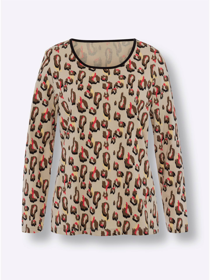 Эта повседневная рубашка сочетает в себе приятные к телу свойства и гармоничный леопардовый принт. Круглый вырез горловины украшен контрастной окантовкой.
