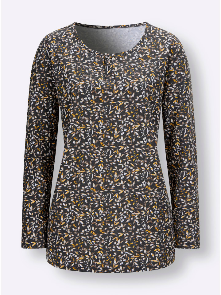 Великолепный модный партнер по великолепной цене: рубашка с длинными рукавами и цветочным принтом, слегка расклешенного кроя. Круглый вырез горловины со сборками.