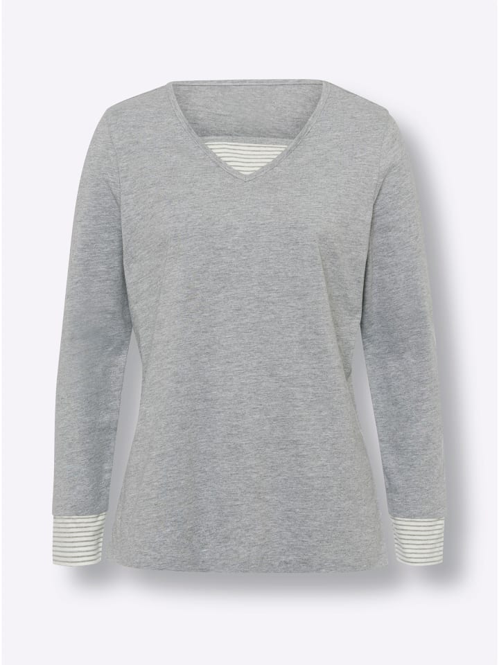 Повседневная рубашка в популярном многослойном стиле. Полосатая вставка на V-образном вырезе и рукавах выполнена из высококачественной пряжи, окрашенной в спортивном стиле.