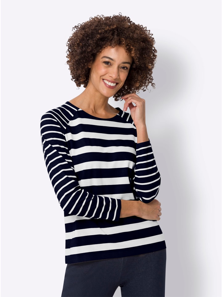 Сочетание широких и узких полосок придает этой полосатой рубашке модный вид. Круглый вырез горловины и длинные рукава реглан. Изготовлена из приятной для кожи ткани.