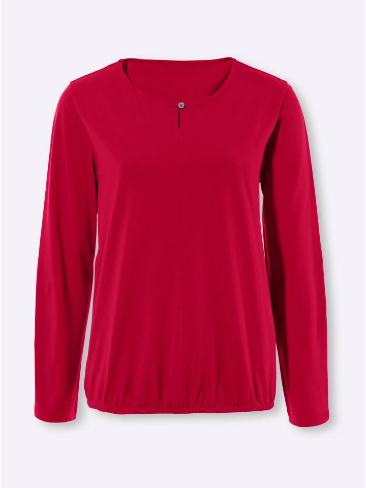 Эта универсальная рубашка с длинными рукавами непринужденно подчеркивает фигуру благодаря эластичному подолу. Круглый вырез горловины дополнен разрезом и застежкой на пуговицы в тон.