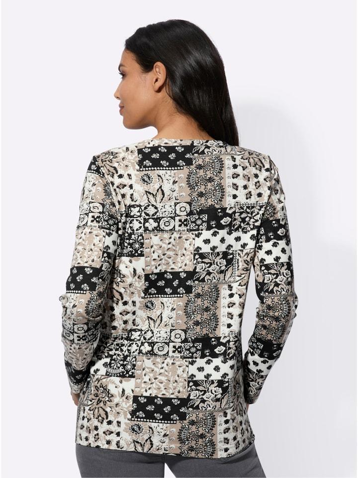 Рубашка с длинными рукавами из приятного к телу хлопка с привлекательным рисунком в стиле пэчворк, легко сочетается с другими вещами. Складки на круглой горловине. Слегка расклешенный фасон.