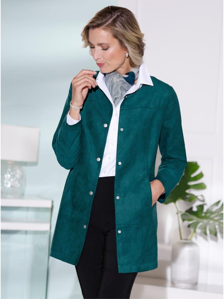 Элегантный замшевый дизайн, подчеркивающий фигуру - этот длинный блейзер, который легко подобрать, станет предметом зависти для всех. Круглый вырез с внутренней вставкой и застежкой на кнопки. Кокетка спереди и формирующие разделительные швы обеспечивают идеальную посадку. Практичные карманы в швах. Боковые разрезы обеспечивают полную свободу движений.