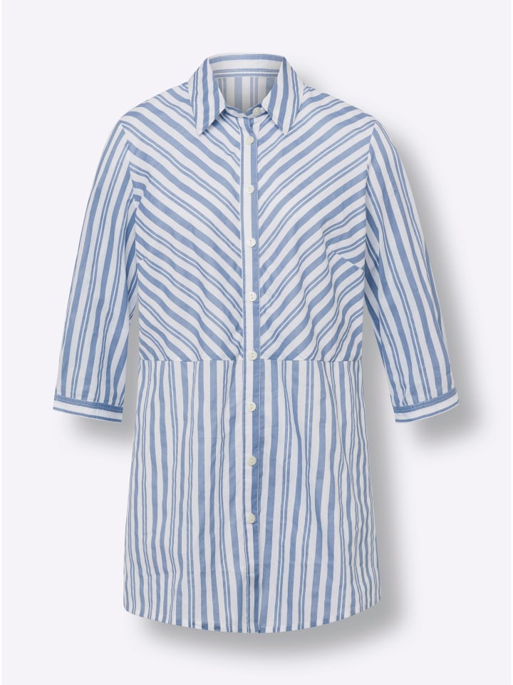 Настоящий хит: эта длинная блузка в стильной полосатой расцветке! Отложной воротник, планка на пуговицах и корректирующие вытачки на груди. Слегка расклешенная к низу. Рукава длиной 3/4 с разрезом и манжетами.