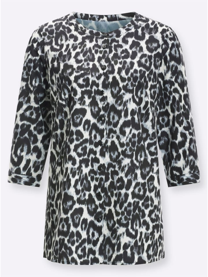 Невероятно красивая длинная блузка с модным анималистичным принтом. Круглый вырез и застежка на пуговицы по всей длине. Манжеты на пуговицах на рукавах длиной 3/4. Вытачки на груди обеспечивают идеальную посадку.