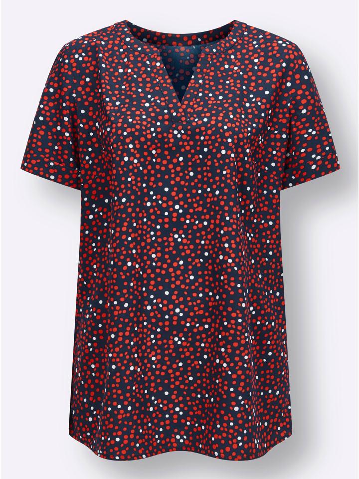 Ни один гардероб не должен обойтись без такой чудесной и простой длинной блузки! С принтом в мелкий горошек по всей длине. Круглый вырез горловины с небольшим V-образным вырезом, вытачки для придания формы груди. Фиксированные отвороты на рукавах, закругленный подол.