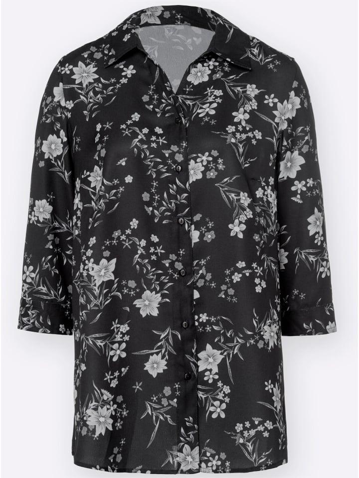 Алла-ла-ла-ла! Эта длинная блузка с красивым цветочным узором, подчеркивающая фигуру, обязательно вам понравится. Слегка расклешенный крой в тренде и умело скрывает недостатки фигуры. Отложной воротник и застежка на пуговицы по всей длине. Вытачки на груди обеспечивают идеальную посадку. Модные рукава длиной 3/4 с манжетами на пуговицах. Слегка закругленный низ спереди и сзади.