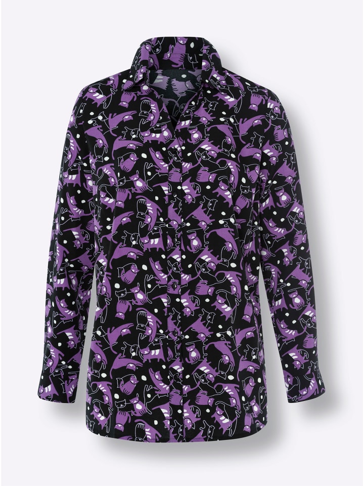 Внимание, любители кошек! Эта длинная блузка с милым принтом в виде кота создаст великолепный, уютный образ! Ткань, не требующая особого ухода, с широким А-образным силуэтом, подчеркивающим фигуру. Открытый воротник, застежка на пуговицы по всей длине и корректирующие вытачки на груди. Длинные рукава с манжетами на пуговицах. Слегка закругленный подол спереди и сзади.