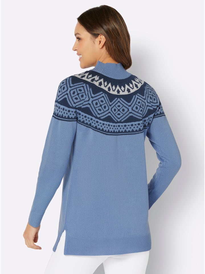 Длинный облегающий свитер со спортивным норвежским жаккардовым узором. Воротник-стойка и ребристые манжеты на длинных рукавах и подоле. Боковые разрезы обеспечивают оптимальную свободу движений.