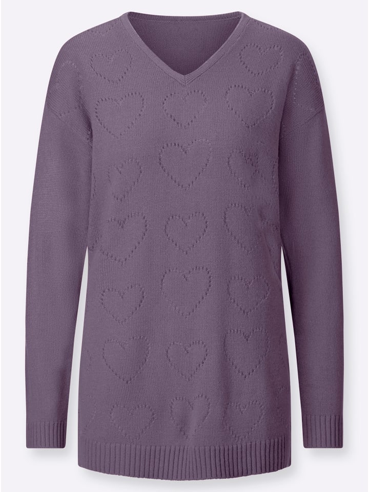 Абсолютно очаровательно! Этот длинный свитер очаровывает своими милыми ажурными сердечками спереди. Он имеет удлиненный силуэт и слегка закругленный V-образный вырез. Ребристые манжеты на длинных рукавах и подоле.