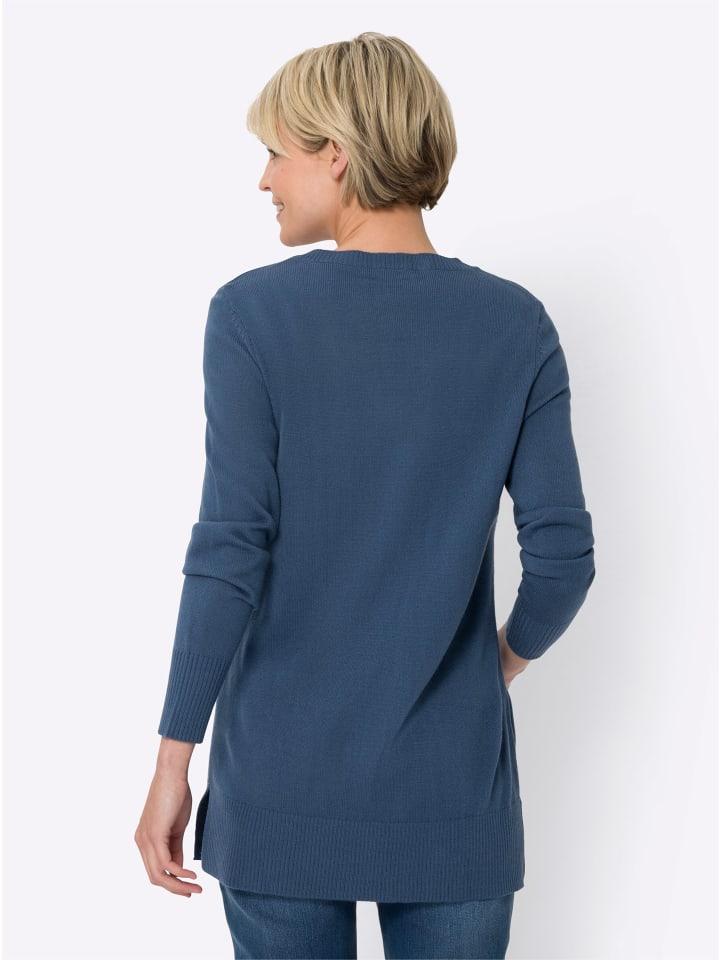 Универсальный фаворит по отличной цене! Длинный свитер с V-образным вырезом и длинными разрезами по бокам. Манжеты и низ - резинка.