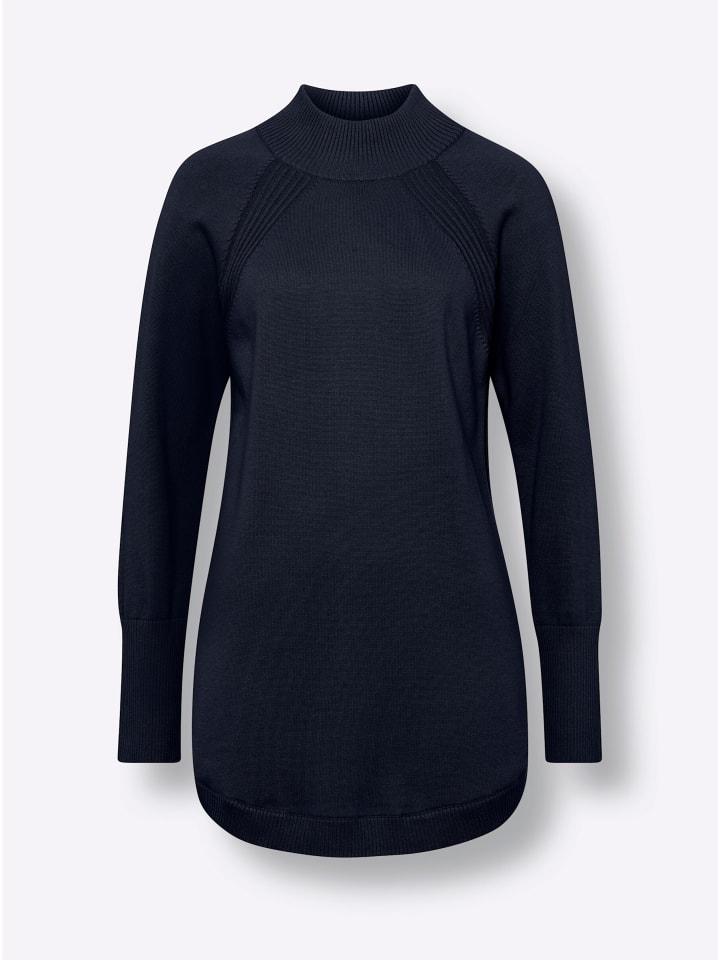 Этот длинный свитер из чистого хлопка - просто прелесть! Он визуально удлиняет фигуру и умело скрывает лишний вес. Великолепный внешний вид благодаря воротнику-стойке, резинке на рукавах реглан, а также резинке на манжетах и подоле. Вязание по фигуре.