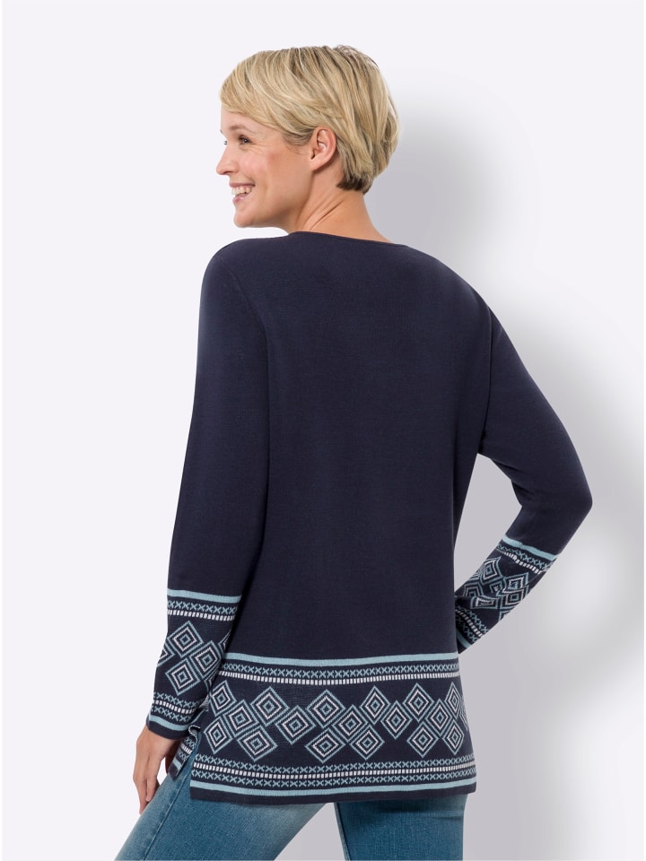Чем длиннее, тем лучше! Этот длинный свитер искусно скрывает, визуально удлиняет фигуру и балует вас благодаря мягкости от горловины до подола. Жаккардовый узор на манжетах рукавов и подоле прекрасно притягивает взгляд. С боковыми разрезами.