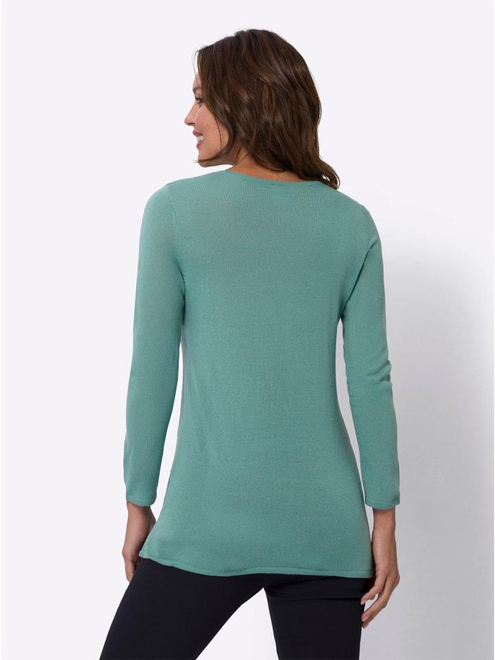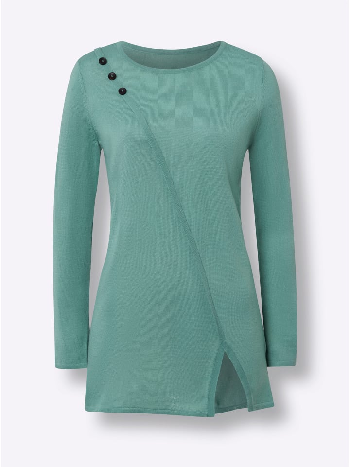 Этот длинный свитер - настоящее украшение! Накладной крой, скошенная вставка и V-образный вырез спереди по подолу. Контрастные пуговицы на плечах.