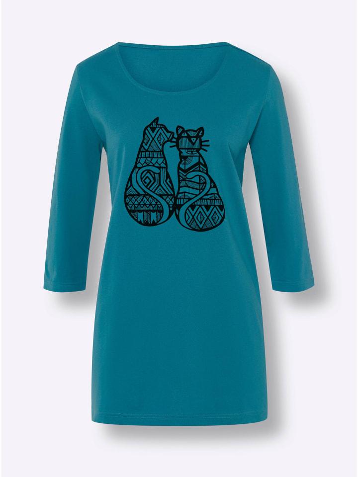Длинный, подчеркивающий фигуру А-силуэт: длинная рубашка с принтом кота спереди.