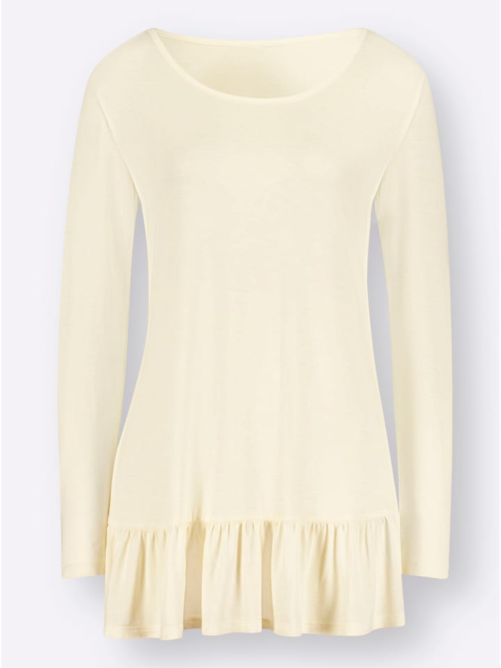 Длинная рубашка с круглым вырезом и длинными рукавами. Пришитая игривая оборка по низу спереди и сзади.