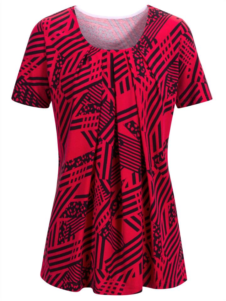 Прекрасно подчеркивает фигуру и по невероятно выгодной цене! Рубашка приятная ширина достигается за счет плиссированной драпировки под круглым вырезом и удлиненного А-образного силуэта. Графический рисунок подчеркивает достоинства фигуры.