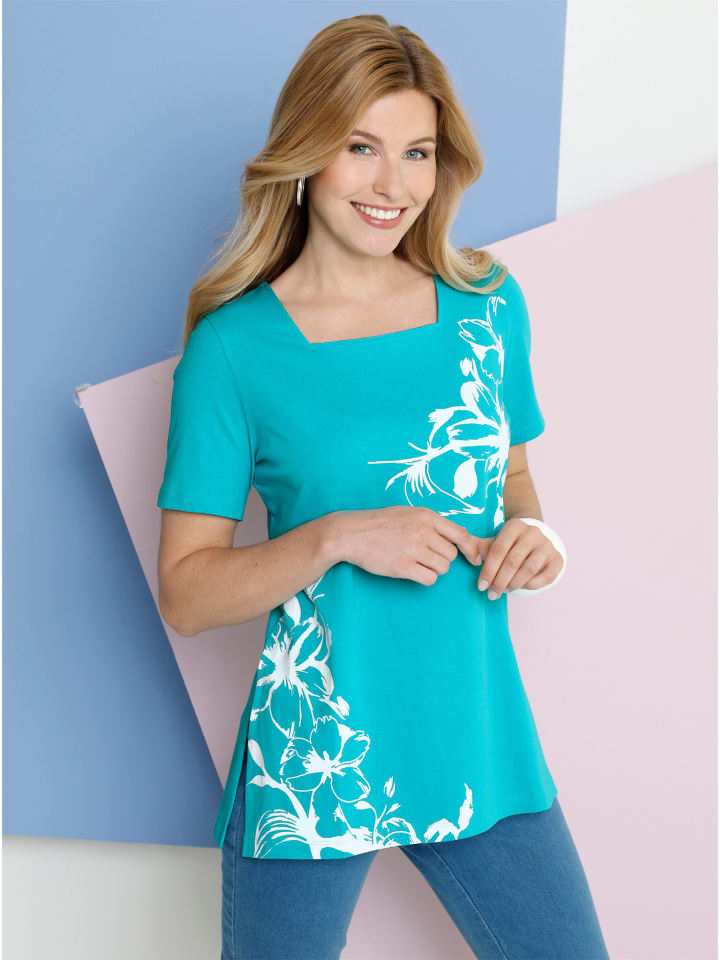 Длинная рубашка: отличный вариант для цветочного дизайна! Квадратный вырез. Очень длинные боковые разрезы. Узор спереди.