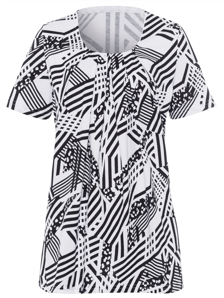 Прекрасно подчеркивает фигуру и по невероятно выгодной цене! Рубашка приятная ширина достигается за счет плиссированной драпировки под круглым вырезом и удлиненного А-образного силуэта. Графический рисунок подчеркивает достоинства фигуры.