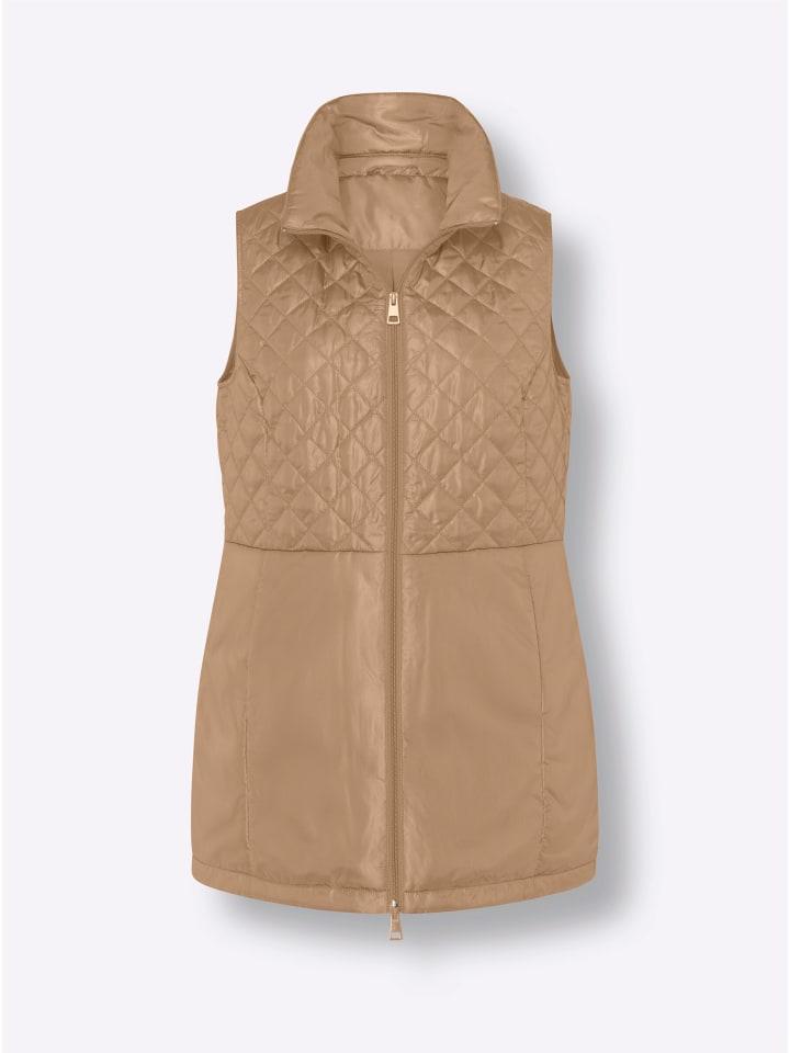 Этот универсальный и модный длинный жилет сочетает в себе ромбовидную стежку сверху и гладкие секции снизу. Он имеет отложной воротник, практичную двухстороннюю молнию и два кармана в швах. Приталенные швы и разделительный шов на талии обеспечивают идеальную посадку.