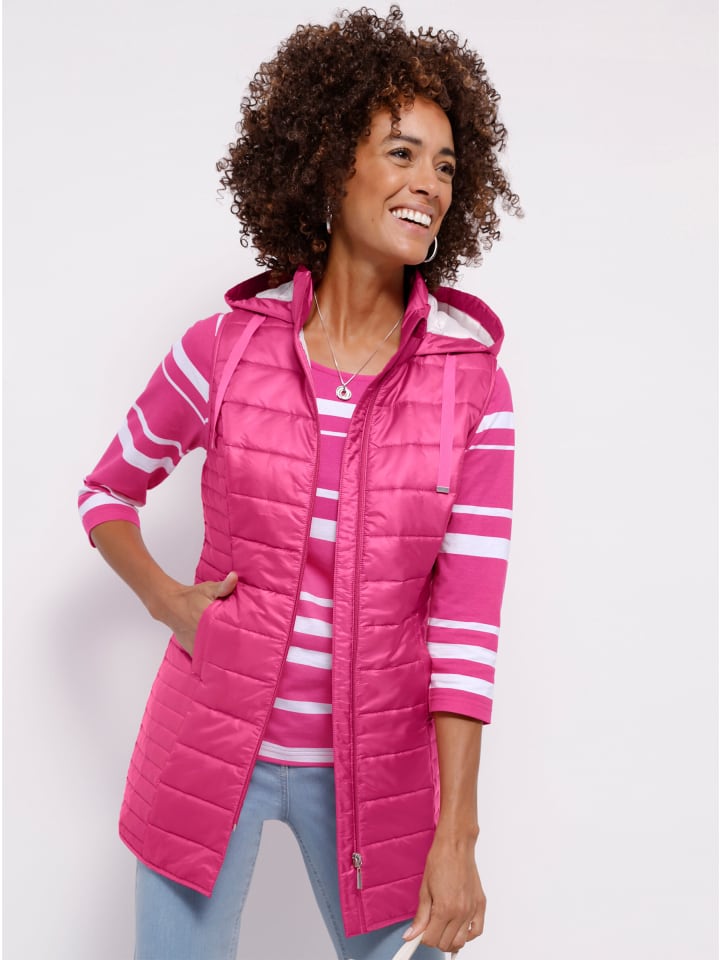 Универсальный и скрывающий длинный жилет с множеством интересных деталей: контрастный капюшон с кулиской, теплый воротник-стойка и застежка-молния. 2 практичных кармана в швах. Широкая стежковая отделка спереди и сзади с узкой стежкой по бокам, подчеркивающая фигуру. Облегающие венские швы. Модная контрастная подкладка.