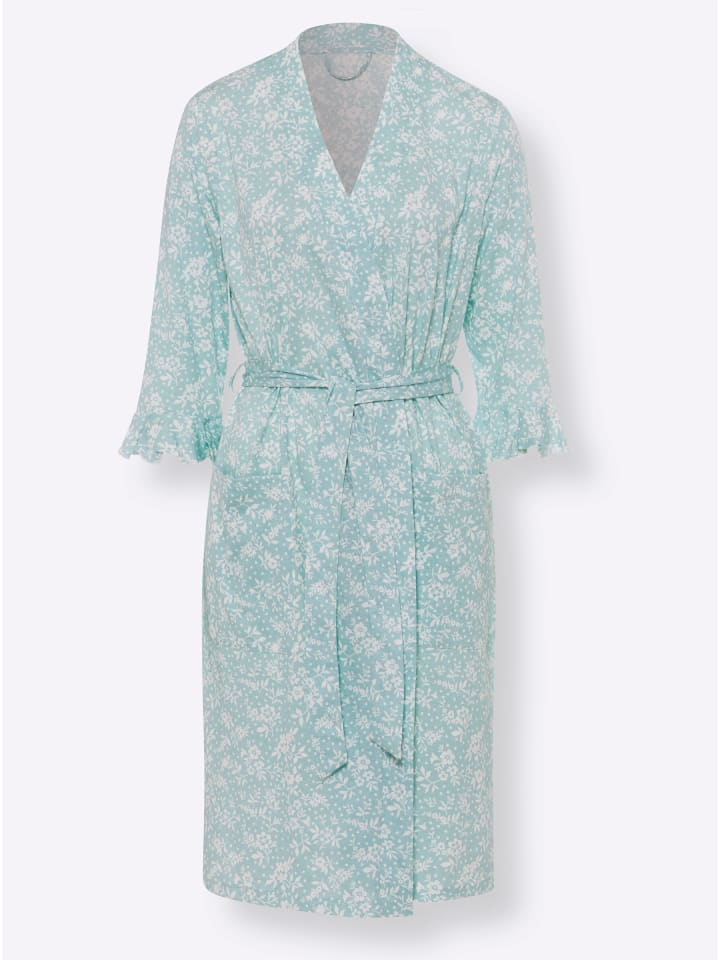 Цветочная магия по утрам: начните день с хорошего настроения в этом халате с очаровательным цветочным принтом! V-образный вырез и рукава длиной 3/4 с пришитой оборкой. Завязывающийся пояс и два накладных кармана. Одинарный трикотаж.