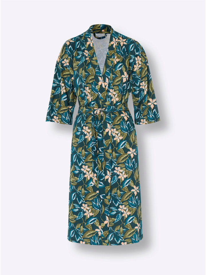 Этот халат из комфортного трикотажного полотна с пышным цветочным и лиственным принтом привлекает внимание. Он выполнен в модном стиле кимоно с V-образным вырезом, спущенной линией плеча, рукавами длиной ¾, шлевками для ремня и завязывающимся поясом с принтом.