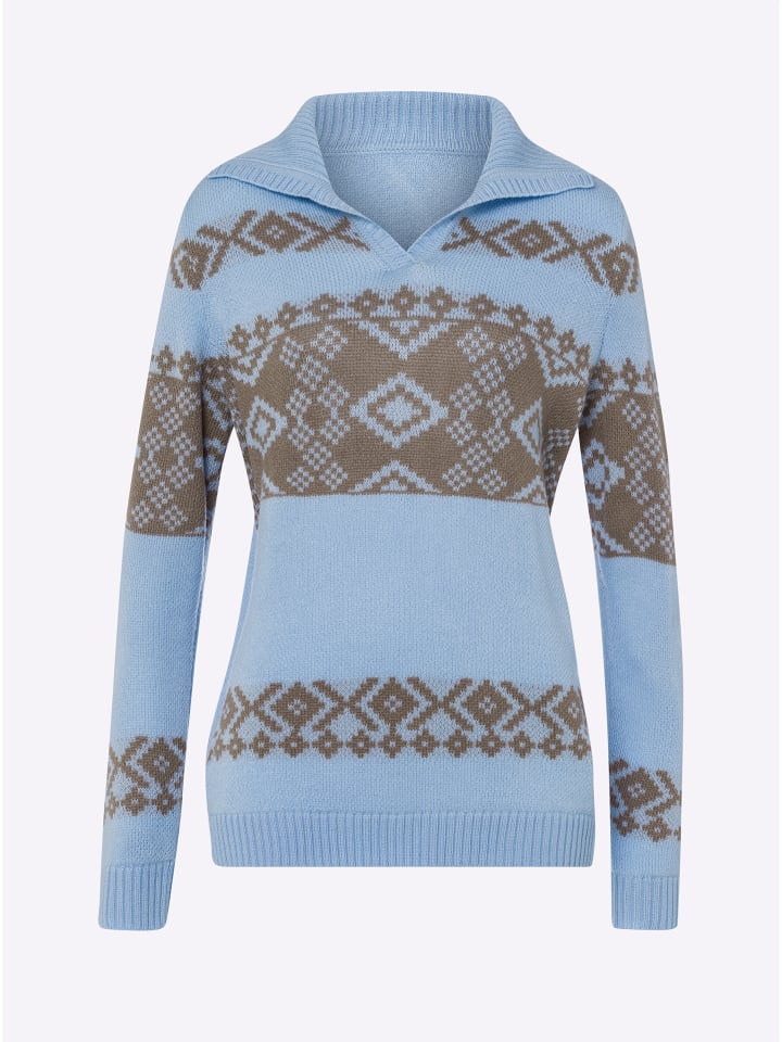 Модный норвежский узор делает этот свитер по-настоящему привлекательным. Отложной воротник с небольшим V-образным вырезом. Ребристые манжеты на длинных рукавах и подоле.