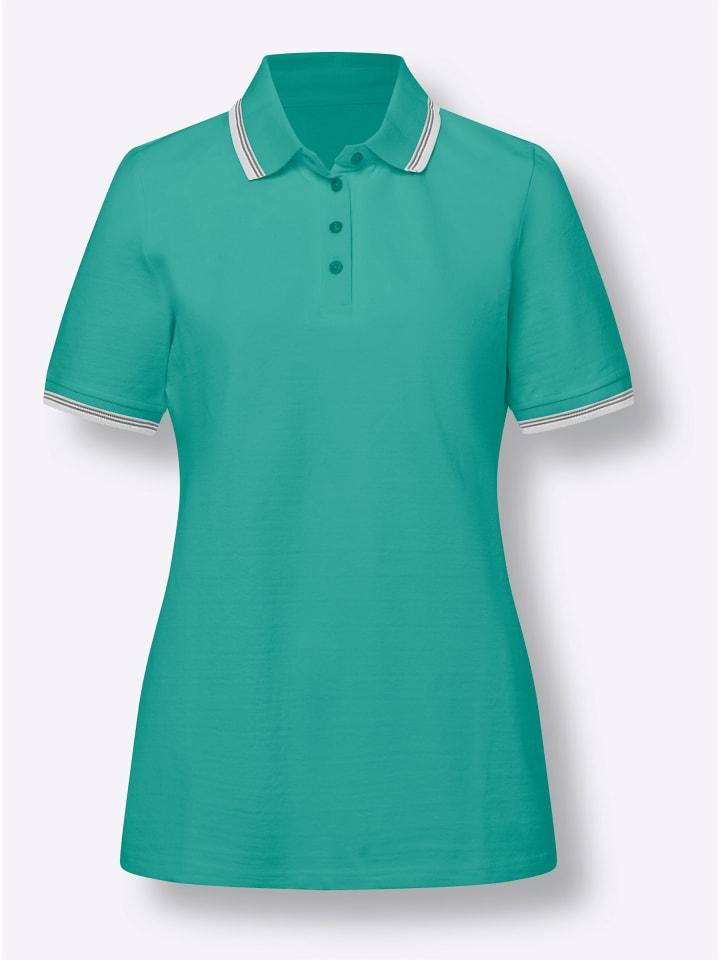 Спортивная рубашка-поло из мягкой ткани пике. Ребристый воротник в полоску и короткие рукава. Застежка на пуговицы.