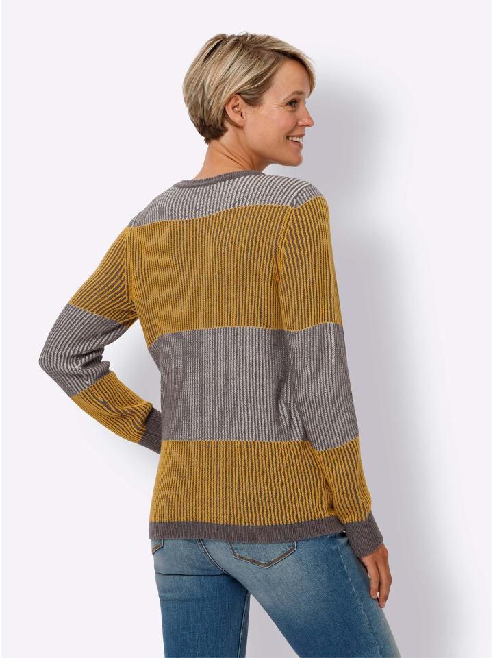 Легко сочетающийся свитер с круглым вырезом, модными эластичными полосками и длинными рукавами. Ребристые манжеты.