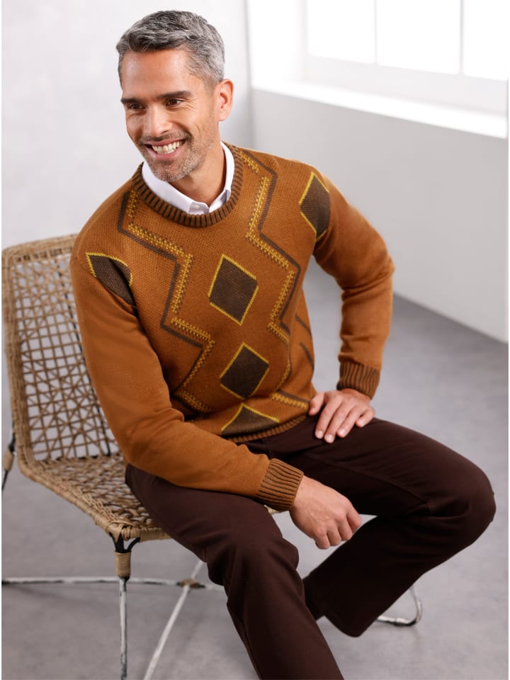 Легкий в уходе свитер с круглым вырезом и изысканным графическим узором спереди. Еще одна привлекательная деталь - двухцветные резинки на манжетах горловины, длинных рукавах и подоле.