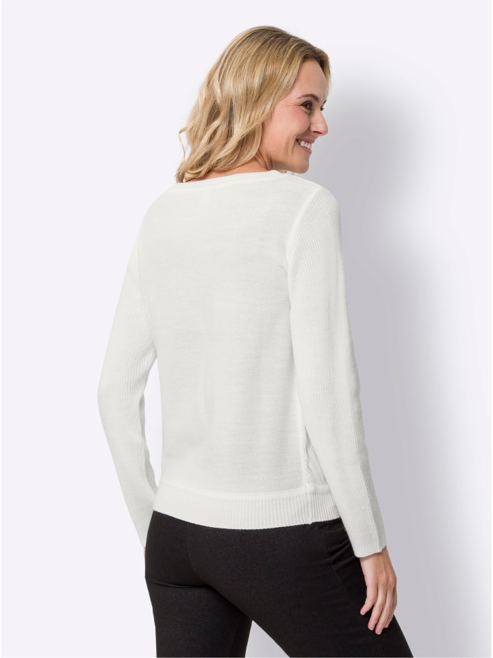 Диагональная резинка спереди, подчеркивающая фигуру, придает этому свитеру особую изюминку. Спинка и рукава связаны изнаночной гладью. Круглый вырез горловины и манжеты рукавов и подола выполнены в резинку. Качество, простое в уходе.