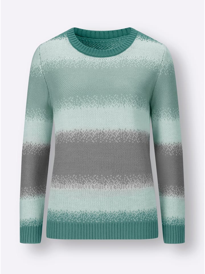 Этот свитер с длинными рукавами выполнен в модном жаккардовом узоре с градиентным эффектом. Круглый вырез горловины, длинные рукава и подол отделаны резинкой.