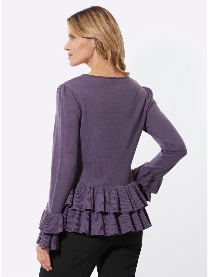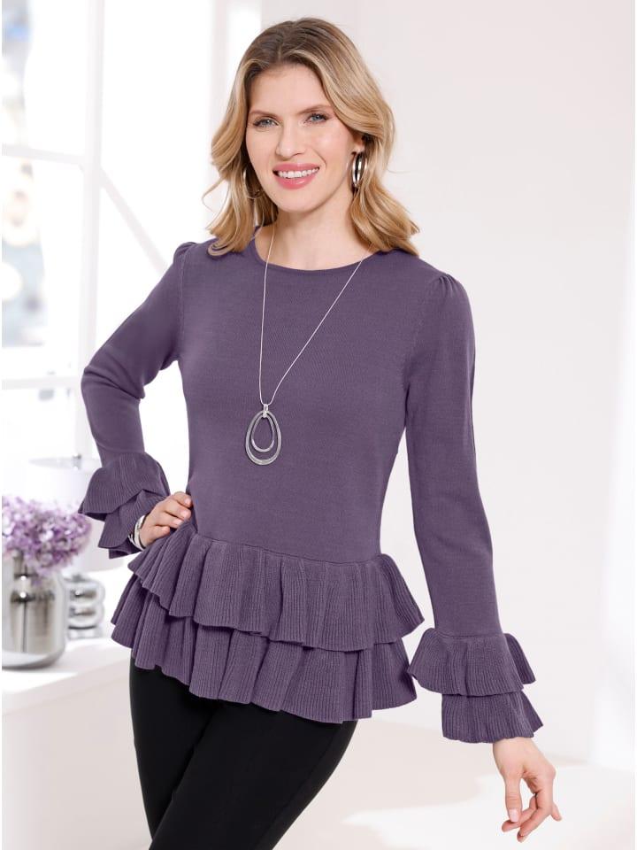 Свитер с круглым вырезом для праздничного настроения! Выглядит особенно женственно благодаря воланам на длинных рукавах и подоле.
