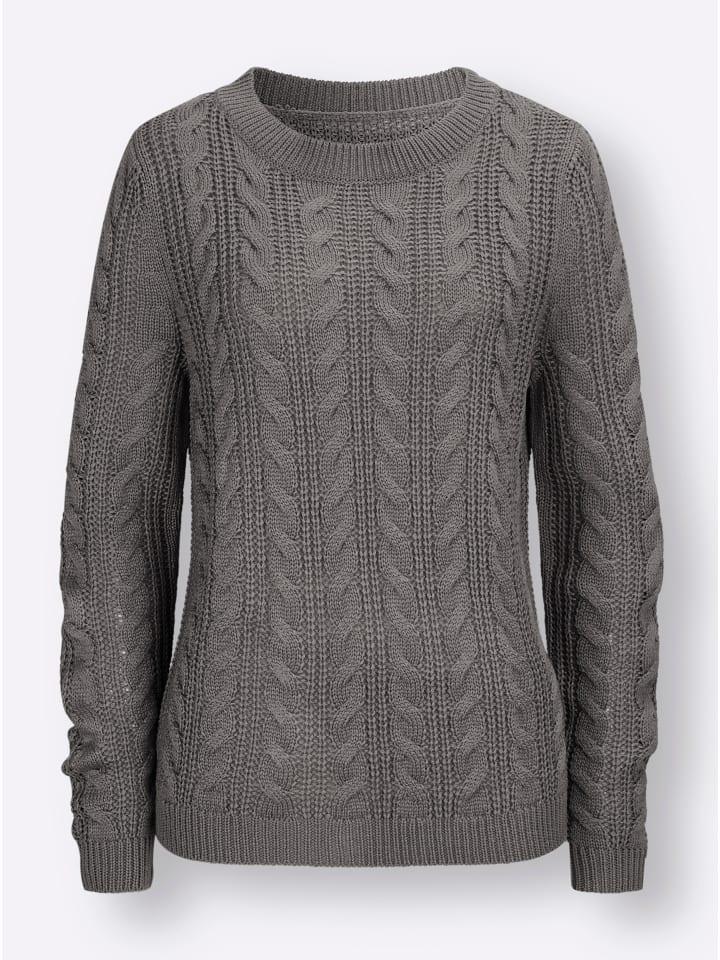 Этот свитер с круглым вырезом производит потрясающее впечатление благодаря декоративному узору косы. Манжеты и низ свитера отделаны резинкой.
