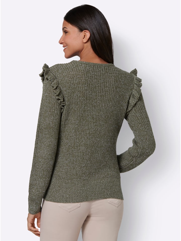 Шикарная вязка! Свитер с круглым вырезом из мягкой меланжевой пряжи. Декоративные оборки на плечах - модная изюминка. Связано по идеальной посадке.