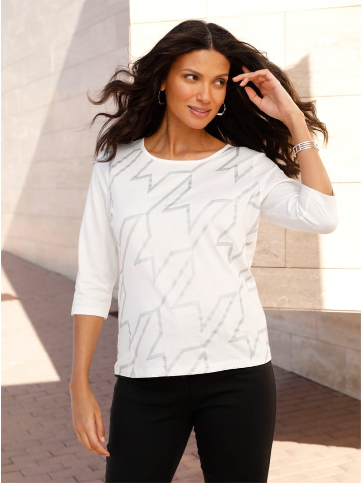 Эта рубашка с круглым вырезом сочетает узор гусиная лапка с серебристой фольгой - потрясающее сочетание! Печать спереди, рукава длиной 3/4.
