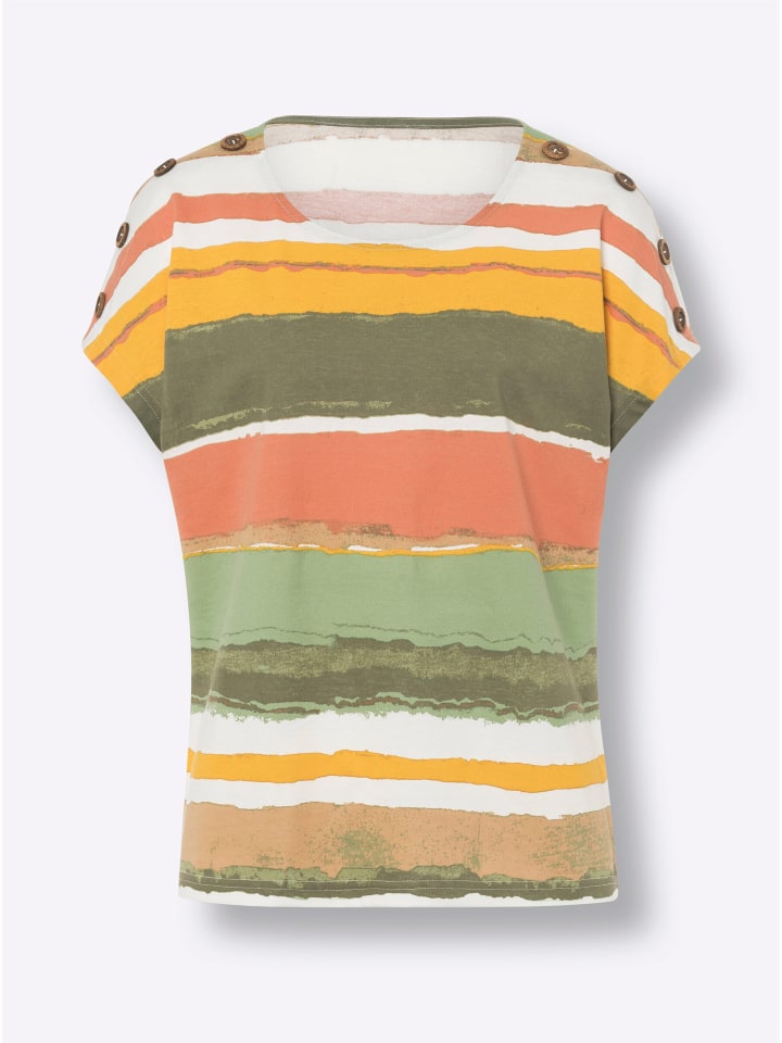 Без колец! Эта рубашка с принтом идеально дополнит ваш спортивный образ. Декоративные пуговицы под дерево на плечах. Круглый вырез и спущенные плечи. Принт нестандартный.