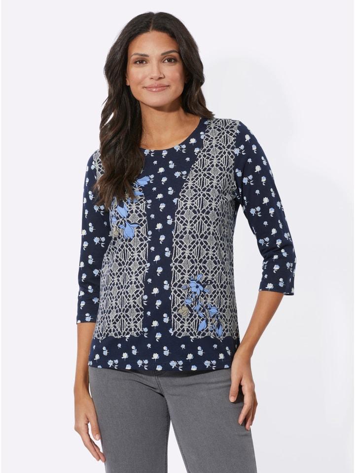 Эта рубашка с рукавами 3/4 создает эффектный образ 2 в 1 благодаря принту спереди, напоминающему ажурный кардиган с цветочной вышивкой. Круглый вырез.