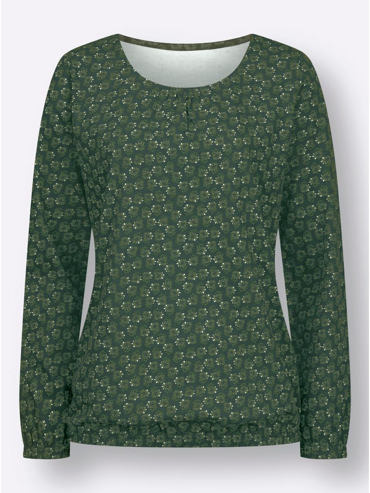 Красивый цветочный узор, подчеркивающий фигуру! Рубашка с длинными рукавами и легкой сборкой на круглой горловине. Эластичные манжеты на длинных рукавах и по подолу скрывают недостатки фигуры.