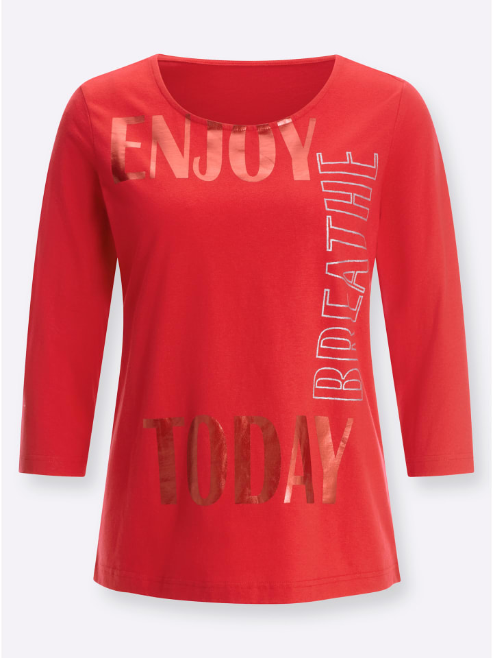 Мерцающий принт с буквами спереди гарантирует, что вы будете блистать, куда бы вы ни пошли в этой рубашке с рукавами 3/4! Круглый вырез и прямой подол.