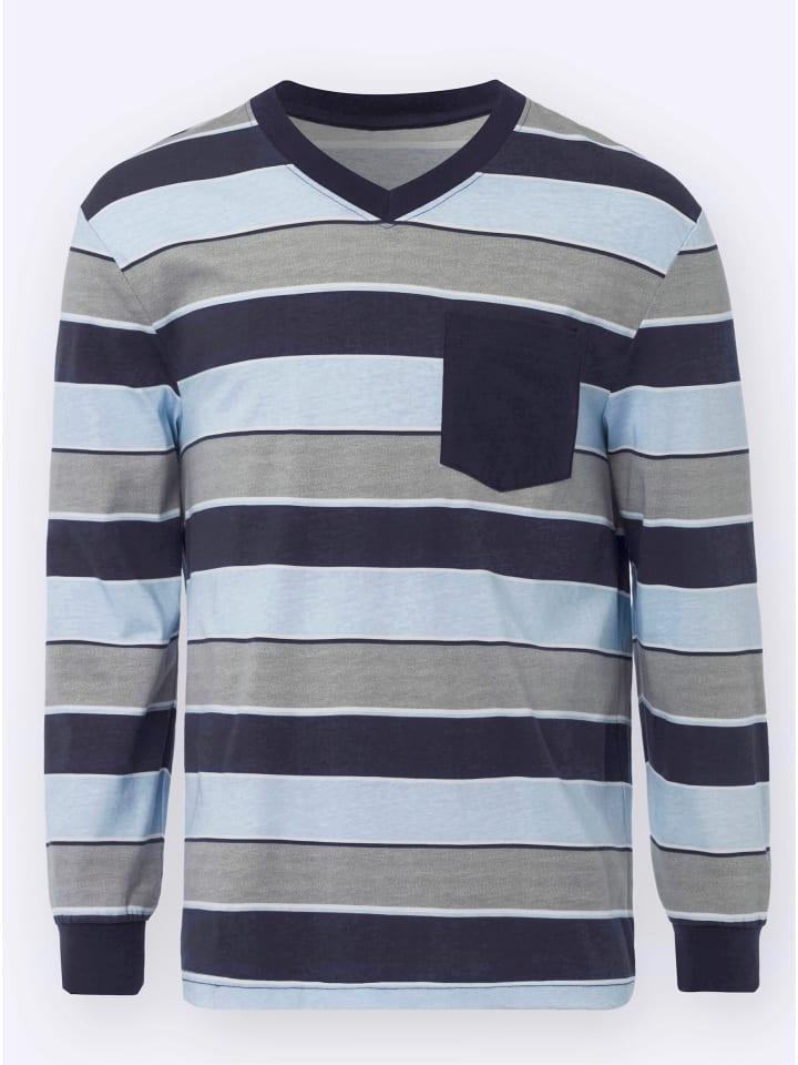 Создано для комфорта: эта пижама не только отлично выглядит, но и приятно ощущается на коже. Верх с модным полосатым рисунком, V-образным вырезом в рубчик, нагрудным карманом и манжетами. Однотонные брюки с эластичным поясом и манжетами. Одинарный трикотаж.