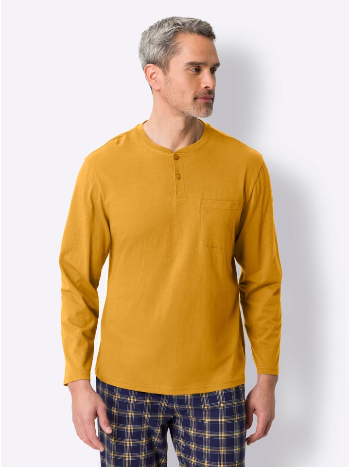 Приятная на ощупь пижамная рубашка с круглым вырезом и короткой планкой на пуговицах. 1 накладной нагрудный карман. Изготовлена из трикотажного полотна.
