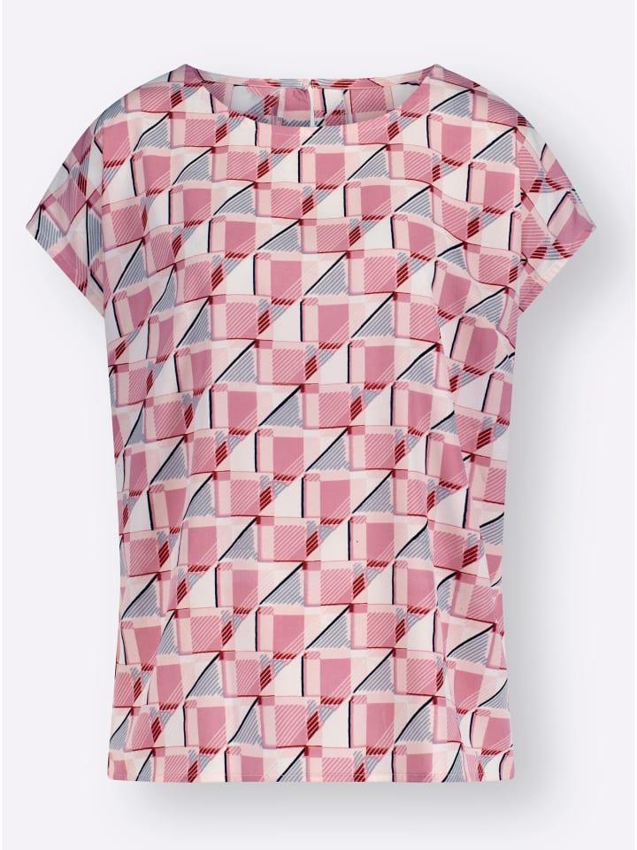 Эта блузка без застежки выполнена из креповой ткани с графическим рисунком. Круглый вырез горловины с разрезом и застежкой на пуговицу сзади, спущенная линия плеча и модно укороченные рукава. Слегка скругленный подол сзади.