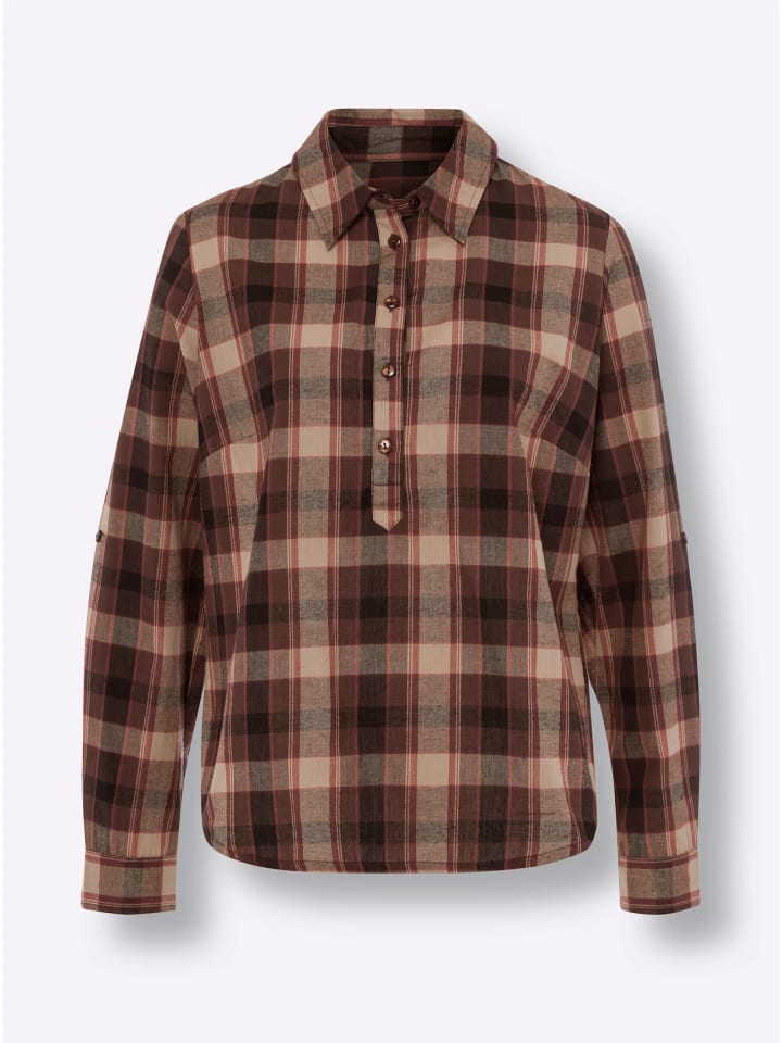 Пушистая фаворитка! Блузка в спортивную клетку из мягкой фланели. Отложной воротник, корректирующие вытачки на груди и короткая планка с пуговицами. Складка сзади скрывает ширину. Рукава можно закатать до 3/4 длины и закрепить. Слегка закругленный низ.